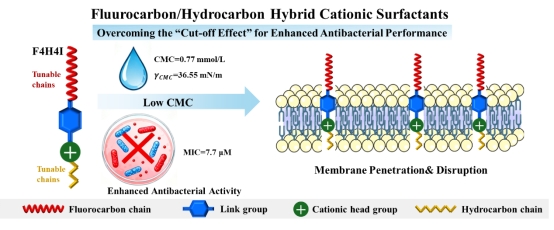 季铵盐表面活性剂(QAS)是一类广泛应用的低毒高效广谱抗菌剂。然而,其抗菌活性常受限于与烃链长度相关的“截断效应”——即烷基链长超过一定长度后,抗菌活性不增反降。为了解决这一难题,吴文海副教授团队创新性地设计并合成了一系列氟碳/碳氢杂化阳离子表面活性剂(FmHnI)。该类分子结构独特,同时包含可调控长度的氟碳链和碳氢链,旨在通过引入氟碳链的特性来克服传统QAS的瓶颈。