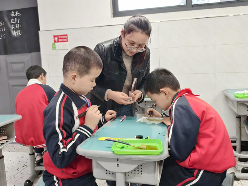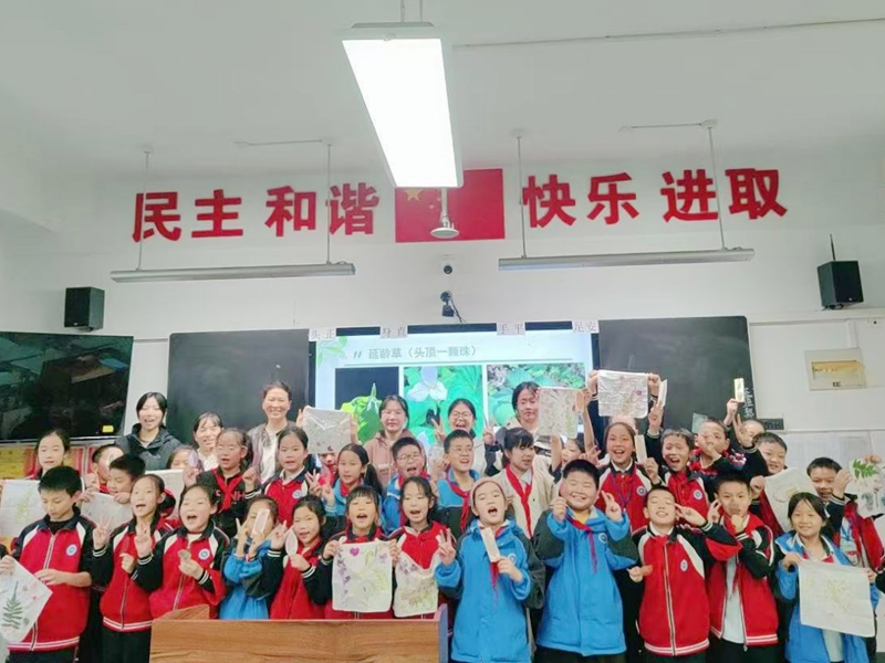 在“药用植物大揭秘”环节,大学生们以“神农四宝”为主线,图文并茂地介绍了七叶一枝花、文王一支笔等秦巴地区特色药用植物的形态与价值,帮助孩子们了解中医药知识,增强生态保护意识。“叶脉书签制作”环节锻炼了孩子们的动手能力。在志愿者指导下,学生们细心刷除叶肉,保留完整叶脉,并用水彩上色,制作出独一无二的书签,感受科学实践的乐趣。“植物拓印”将活动推向高潮。在遵守“尊重自然、不过度采摘”的约定下,孩子们通过敲击方式将植物纹理拓印到方巾上,在艺术创作中体会与自然和谐相处的意义。