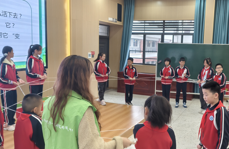 在“智慧守护·创造篇”环节,围绕“假期自动浇水”的实际问题,大学生带领小学生动手制作简易浇水装置。利用塑料瓶、输液管等材料,孩子们在操作中理解大气压与虹吸原理,激发了对工程思维与科技创新的兴趣。“生态守护·认知篇”通过“生态网游戏”和“黄精生长拼图”,帮助学生构建系统生态观念。小学生分别扮演生产者、消费者与分解者,用毛线编织“生命之网”,直观感受生态系统中各环节的紧密联系。“劳动守护·践行篇”将课堂延伸至“黄精种植责任田”。学生在大学生指导下清除杂草、观察黄精休眠状态,体验劳动过程,增强对生命成长的责任感与实践能力。